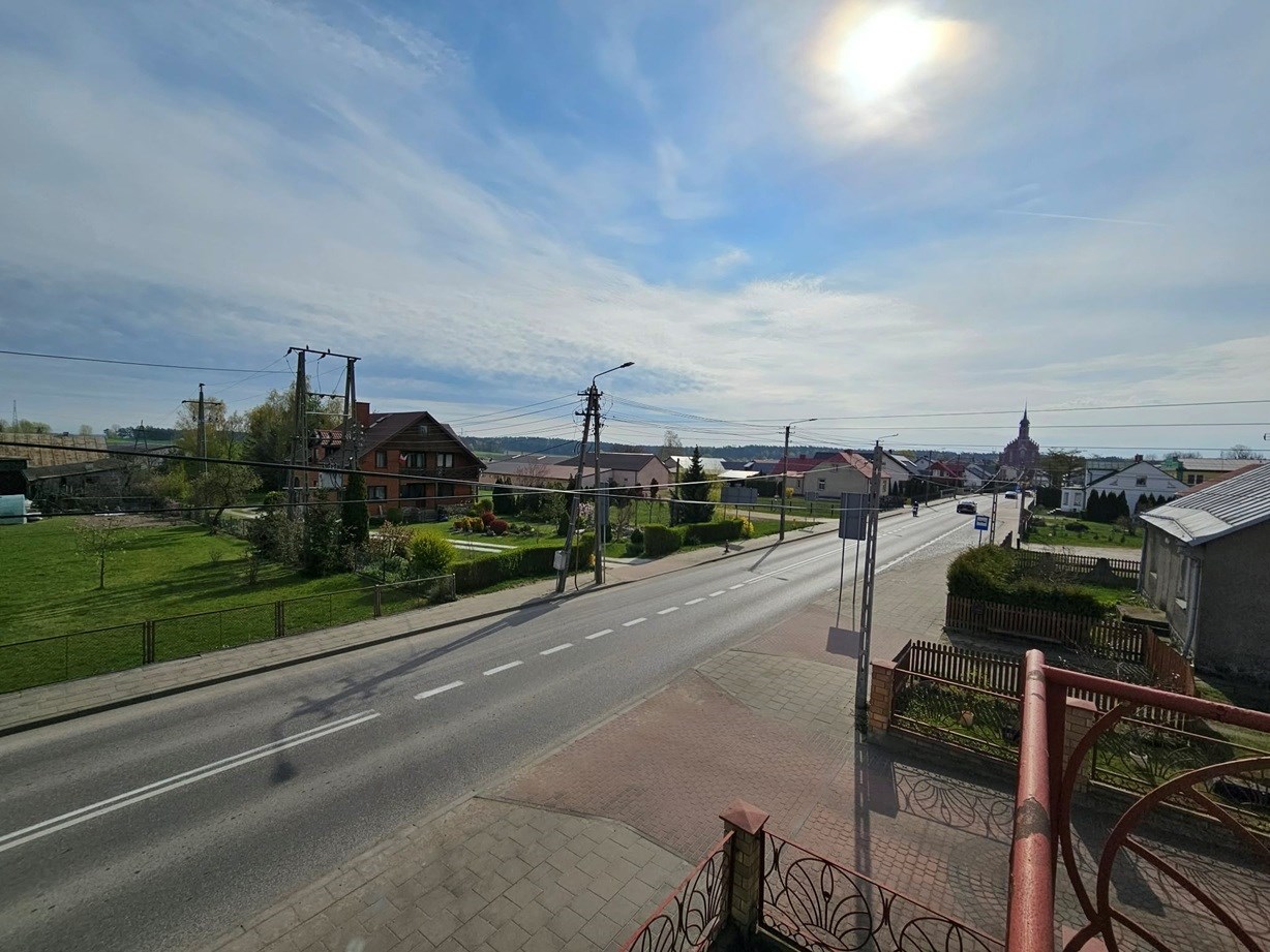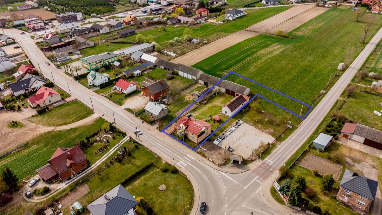 Dom posadowiony jest na dużej, zadbanej działce o powierzchni 1980 m², z wygodnym dojazdem z dwóch stron: drogi gminnej i drogi wojewódzkiej nr 681.