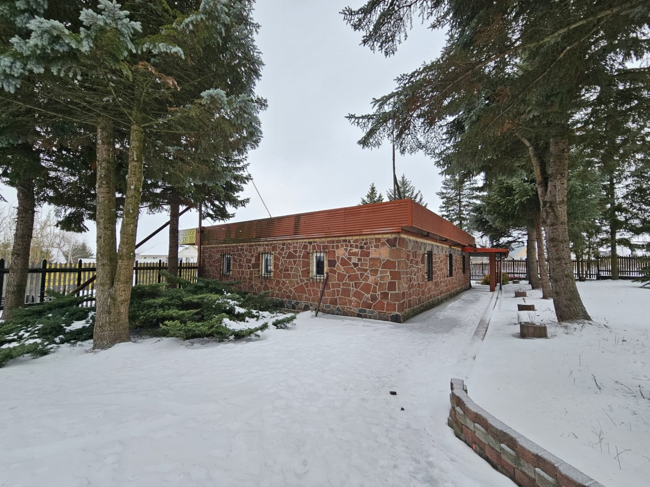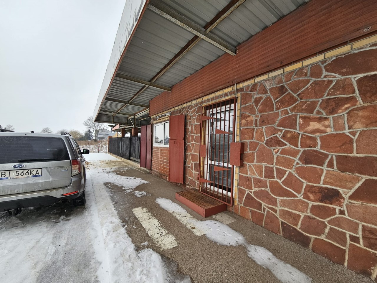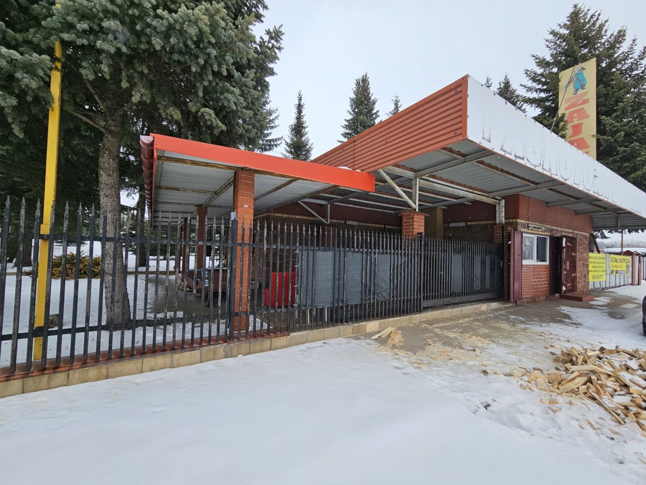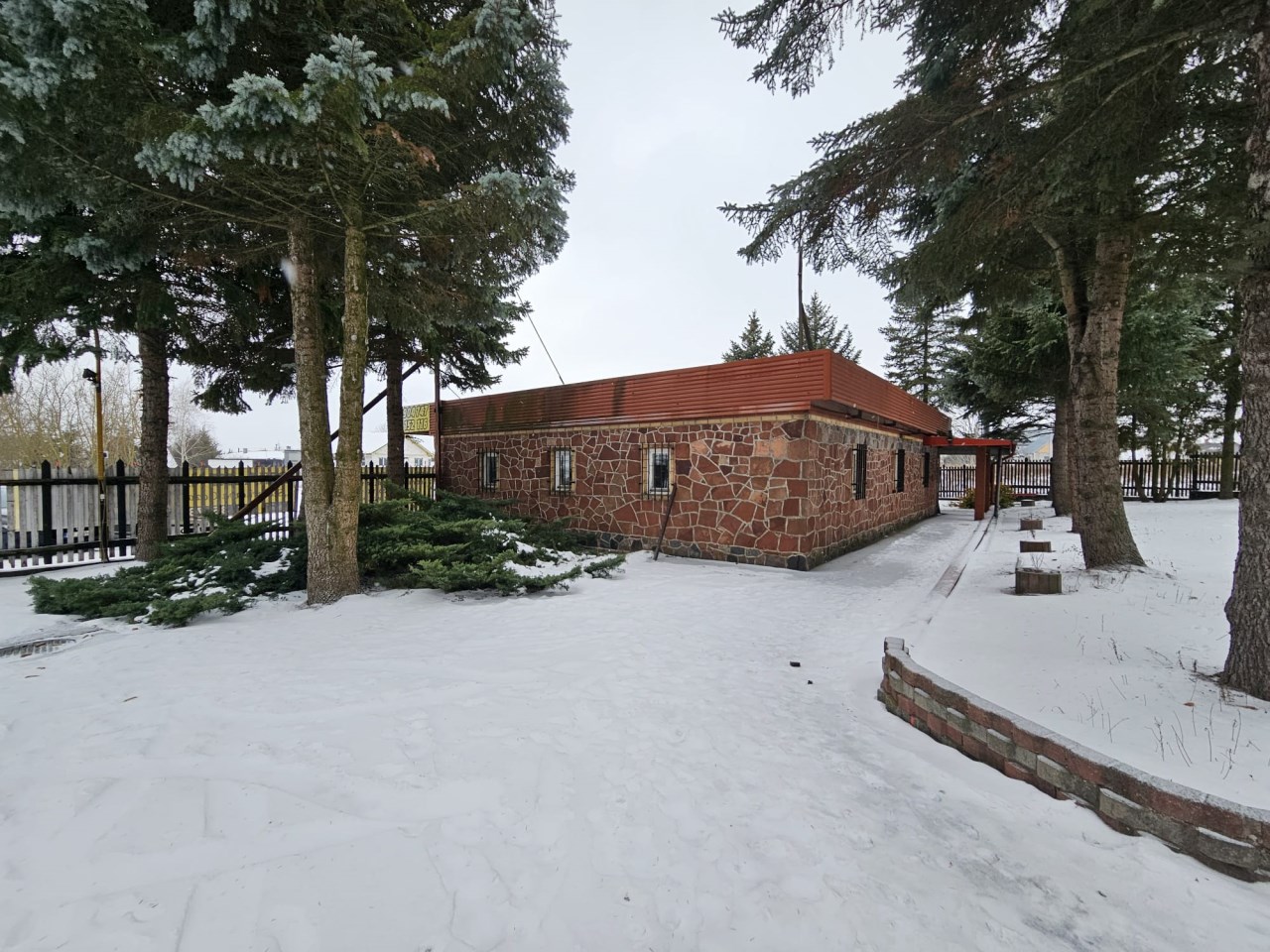 Na drugiej działce o pow, 348m2 i wym. 12,31m x 29,20m, posadowiony jest parterowy, murowany budynek z połowy lat 90-tych o pow. 83m2, który dawniej pełnił funkcję baru. W bryle budynku znajduje się również zadaszona wiata. Nieruchomość składa się z dwóch przechodnich pomieszczeń, zaplecza w tym też sanitarnego i kotłowni. Do nieruchomości doprowadzone są: woda miejska, prąd, linia telekomunikacja i szambo. Budynek ogrzewany jest piecem na opał stały.